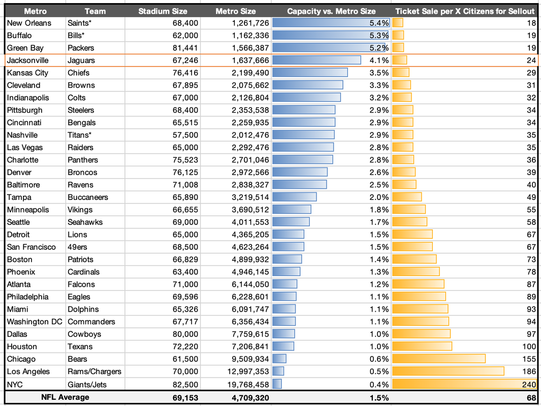 The average NFL stadium capacity is 1.5% of the size of its corresponding metro. We're at almost three times that, at 4.1%. This necessitates 1 in 24 Jaxons purchasing a ticket to a Jags game to fill the stadium, vs. a league-wide average of 1 out of every 68 locals.