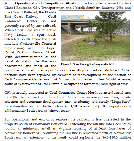 Meanwhile at Cecil, the clueless legions that nixed funding for transportation improvements citywide, can't understand the slow growth. This comes after allowing new roads and buildings to claim the right of way that was once the Cecil Field railroad branchline. Who wants 19th century technology at a 'space port?'