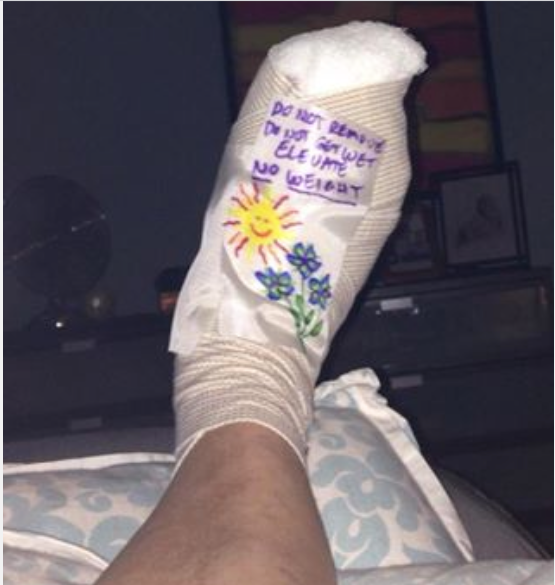 What happened? Broken foot? NOT EVEN CLOSE Y'ALL, much worse then that. Spinal stenosis has caused my toes to curl under my foot AND make a left turn. I've been walking on the tops of my toes for a couple of years now, thus the occasional cane. They had to break all of the toes, remove one joint, realign the bones, muscles and tendons and then fuse the whole thing together again.