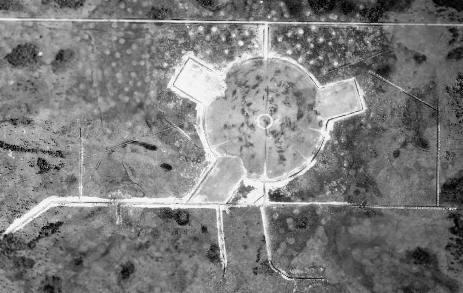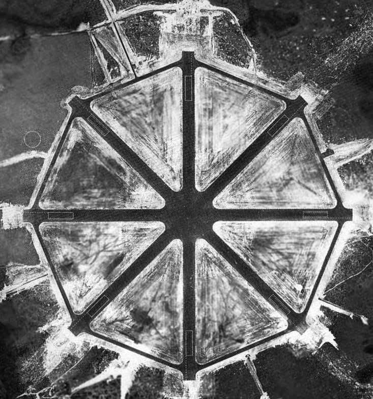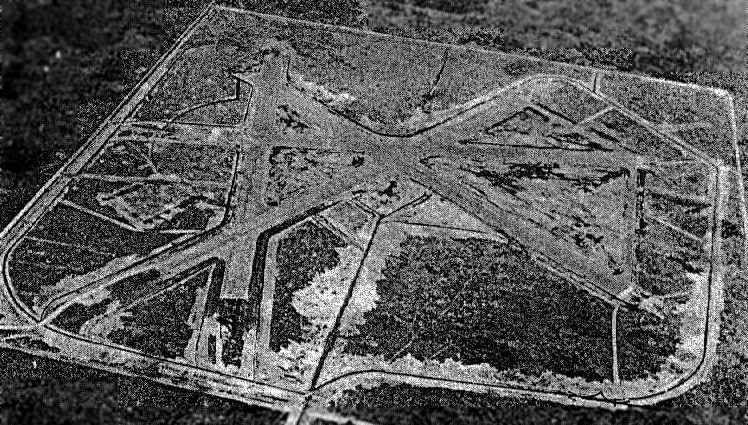 A well used Branan Field. Even looks like some traffic on a longer approach upper right. It was shaped like this and marked off in Air Craft Carrier lengths. So as a carrier turned into the wind, whatever the compass setting, the field could copy it with a simple wind sock.
