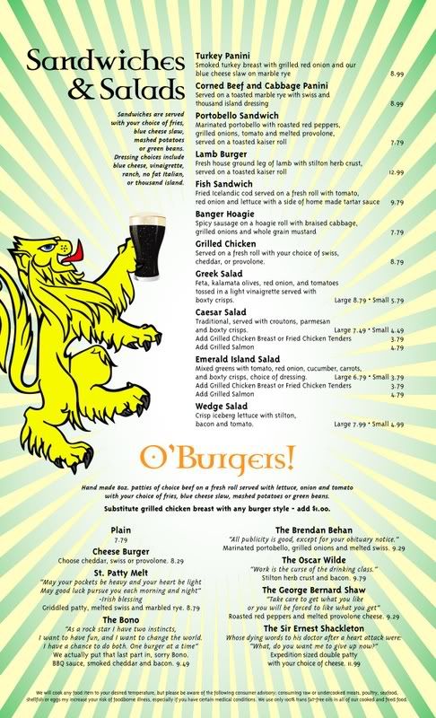 To start with, the food is very simple, mainly comprised of your typical "family level" restaurant fare, but with everything having been given cliche Irish-sounding names. The concept is pretty much the same thing as Bennigan's. The Bangers & Mash and the Shepherd's Pie are about the only UK-inspired items on the menu, with the rest of the selections being your typical cheeseburgers, breaded chicken tenders, buffalo wings, yada, yada.