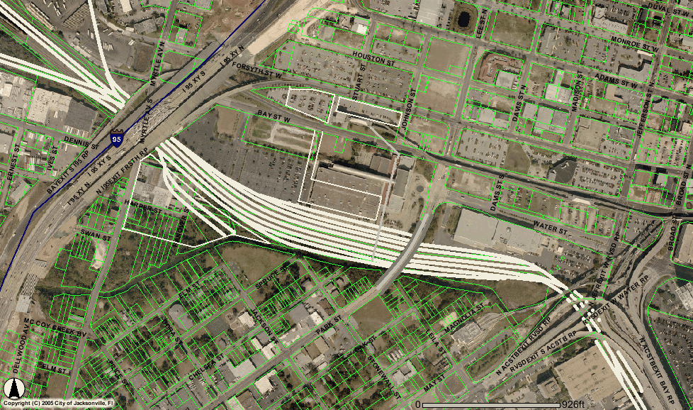 I rode the 'way to Kings Station yesterday, and noticed it would be difficult to continue an elevated track directly south - after going under/over 95, the JEA power station blocks further progress, followed by the San Marco Library.