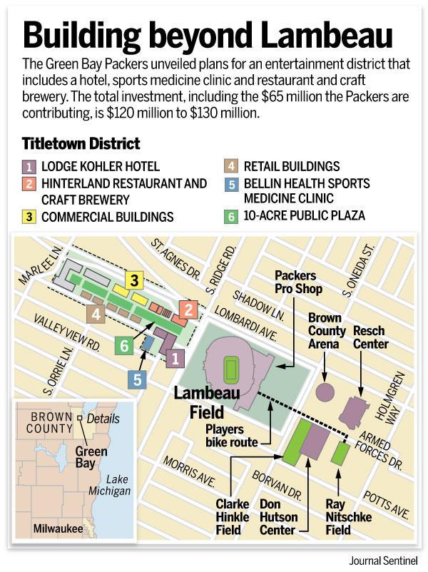 The Green Bay Packers announced details on Aug. 20, 2015 for the master plan for the Titletown District, a destination area to be created on approximately 34 acres of land immediately west of Lambeau Field.