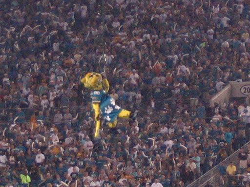 Although not collegiate, it cannot be overlooked - One thing that I think we can ALL agree on is that JAXSON DEVILLE is hands down the best thing going in the NFL -  No other team's mascot even comes close to pulling off the daredevil stunts & theatrics as this "cat".