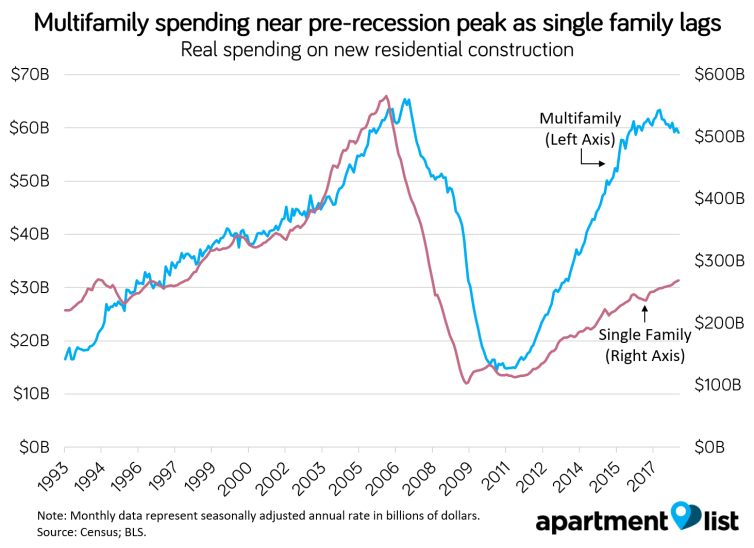 That's a good question, and something to really start paying attention to (the smart ones should have paid attention two years ago). In general, multifamily has gotten into bubble territory. This is a nice chart that shows multifamily construction skyrocketing to pre-recession levels... while single family construction has clearly lagged behind. You don't need to be an economist to look at that and see a problematic trend.
