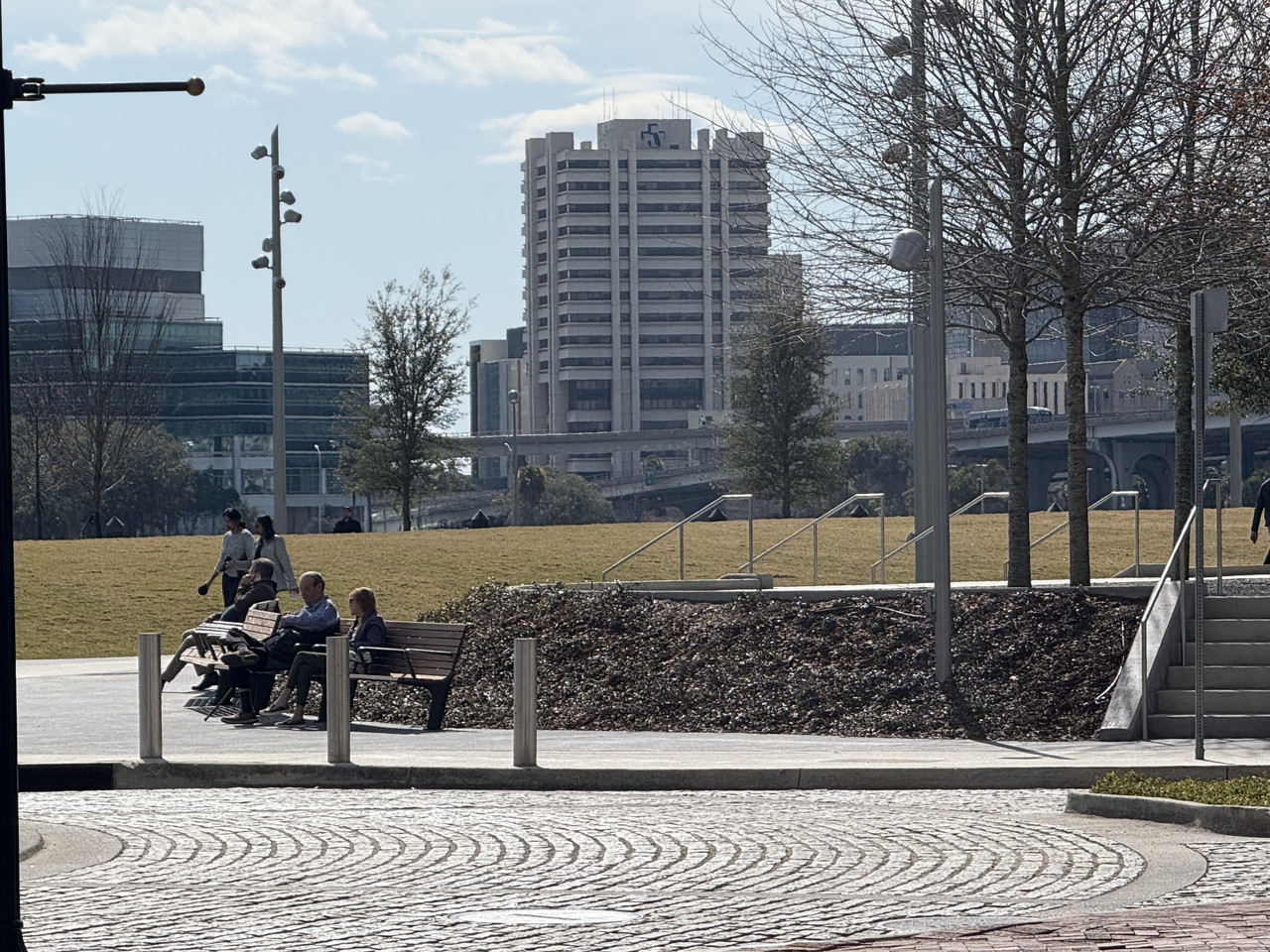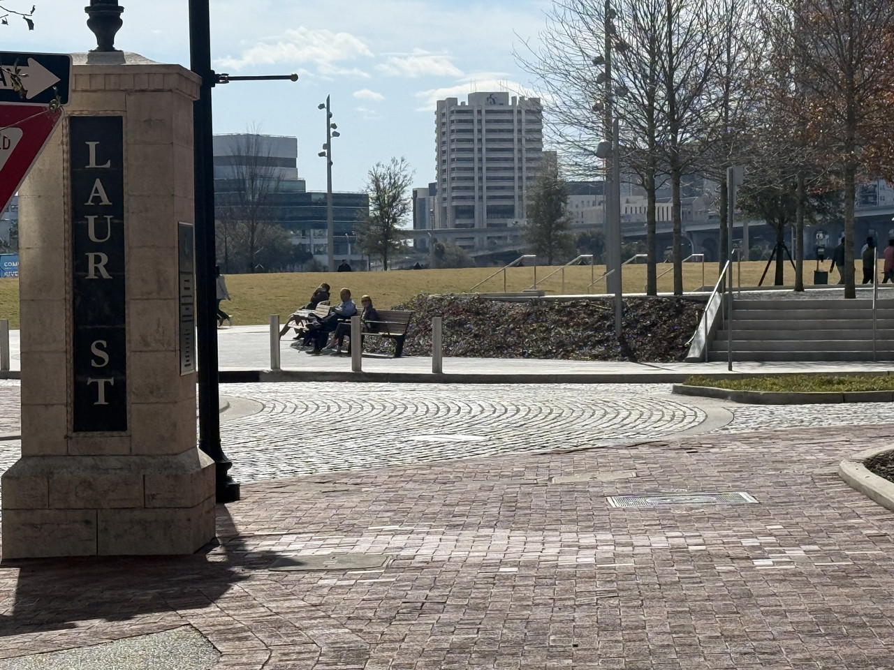 After a decade or two of discussions about the need to open up the Landing in the center to allow river views from Laura Street, it's quite hard to even see the river from Laura Street because the central lawn is elevated. You just kind of see a grass mound. Was kind of surprised when the construction fencing came down that the river view was so obstructed.