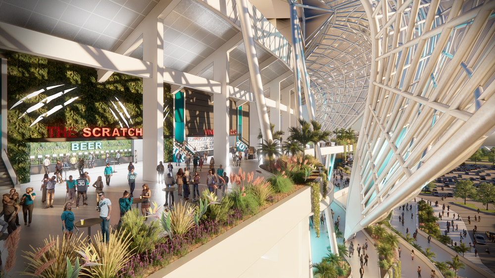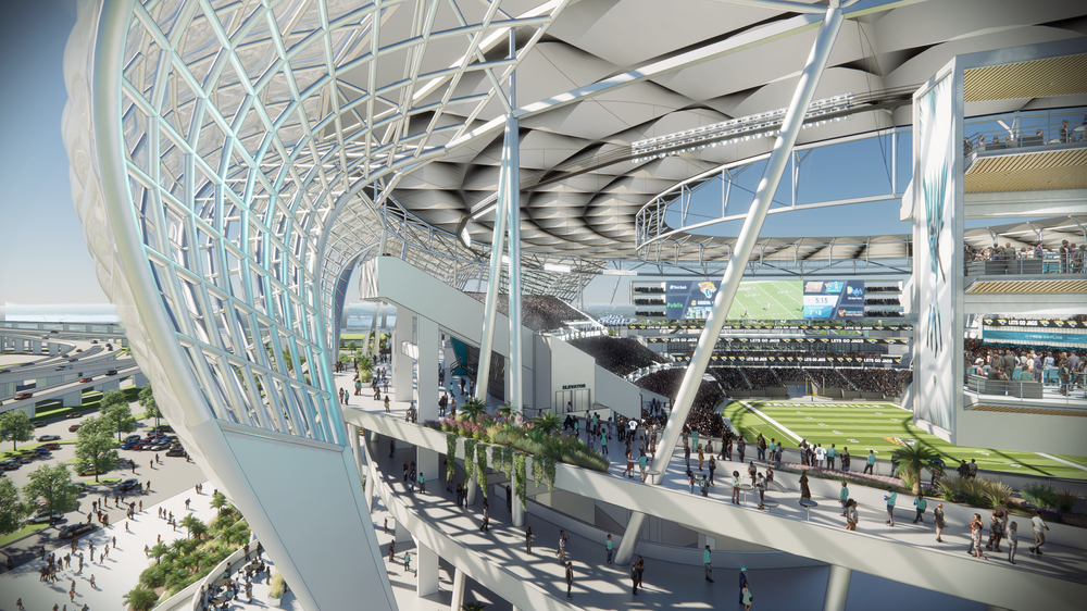 The design employs the addition of a large structural ETFE clad shell whose shape recalls the claws of the Jaguar. Several variations were studied including a retractable ETFE "lens" to fully cover the field and removable turf. Concourses are widened and integrated with the surrounding landscape in a much more natural terraced configuration taking advantage of the lush Florida landscape. One unique feature of the design was an "occupied" video board that included VIP seating and supporting amenities. This video board becomes the Jacksonville equivalent of LA's famous Hollywood sign.