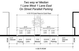 Ock, what is your median width shown in this image?  I'm wondering how it impacts the width of the through traffic and parallel parking lanes.